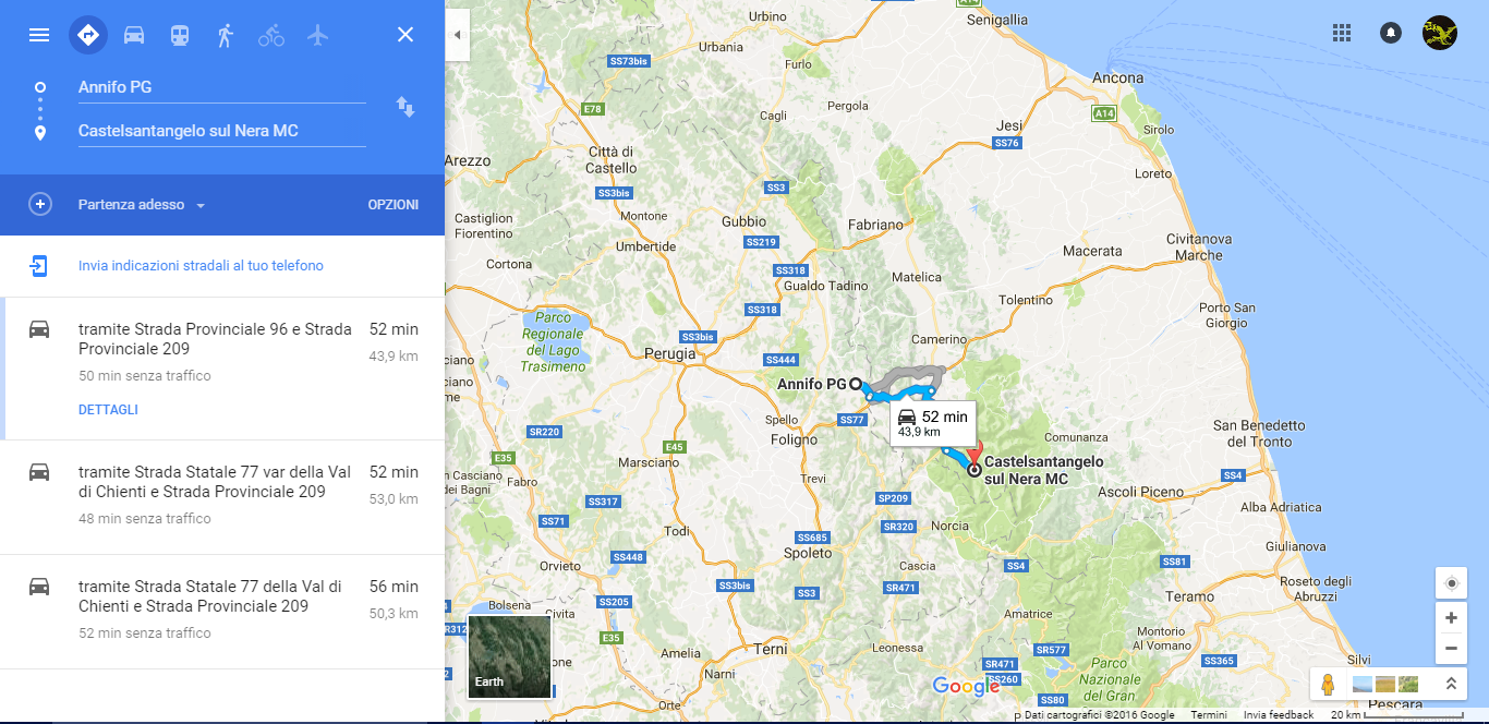La distanza tra l'epicentro del 1997 e quello di mercoledì su Google Maps. Se la strada più diretta tra i due luoghi è di una quarantina di chilometri, in linea d'aria non sono più di trenta. |